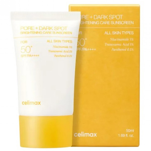 CELIMAX Pore+Dark Spot Brightening Care Sunscreen - освітлювальний сонцезахисний крем для щоденного використання поєднує високий рівень захисту SPF 50+ PA++++ із доглядовою дією. Завдяки сучасним хімічним УФ-фільтрам засіб ефективно оберігає шкіру від UVA- та UVB-випромінювання, водночас допомагає вирівняти тон, зменшити пігментацію та підтримати здоровий вигляд шкіри.