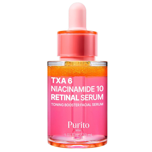 Purito Seoul TXA 6 Niacinamide 10 Retinal Serum - освітлююча сироватка з ретиналем, ніацинамідом і транексамовою кислотою, створена для корекції пігментації, вирівнювання тону та антивікової підтримки шкіри. Легка формула працює на оновлення клітин, покращення текстури та зміцнення бар’єру, надаючи обличчю здорове сяйво.